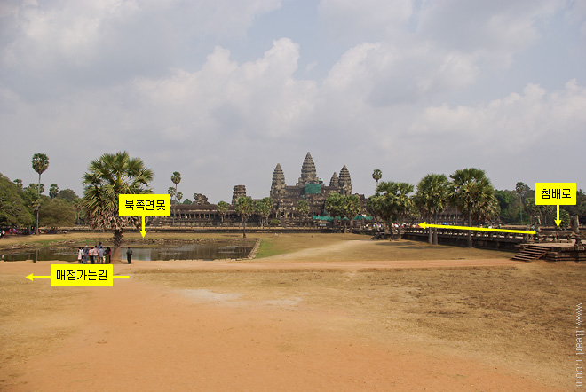 참배로 북쪽에 있는 연못이다. 앙코르 와트에서 일출 광경이 최고 좋은 곳이다. 이른 새벽 사진찍기에 좋은 곳은 빨리 자리가 찬다. 사진을 찍으려면 일찍가야 한다.