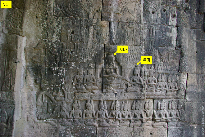 바이욘 2층 회랑 N3을 들어가자마자 있는 서쪽면의 부조이다. 시바 신이 궁전 가운데 앉아 있고, 그의 부인 우마가 오른쪽에 앉아 있고, 그 외 추종자들이 주변에서 시바 신에게 경배를 하고 있다.