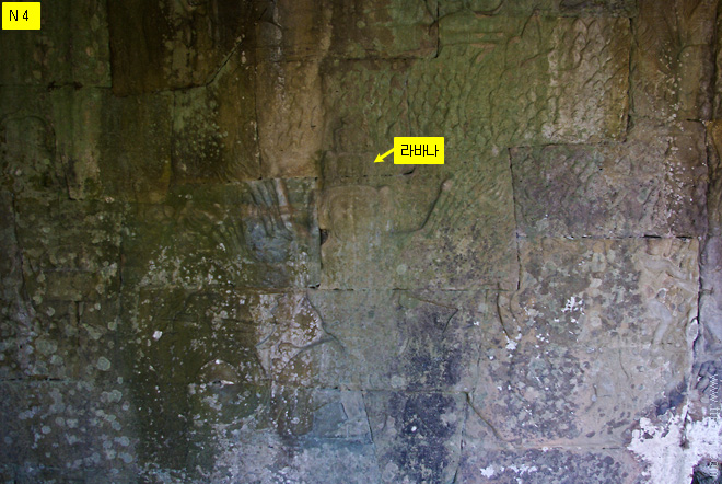 바이욘 2층 회랑 N4의 남쪽면 마지막 장면으로 부조 훼손이 심하여 어떤 내용인지 알기 어렵다.