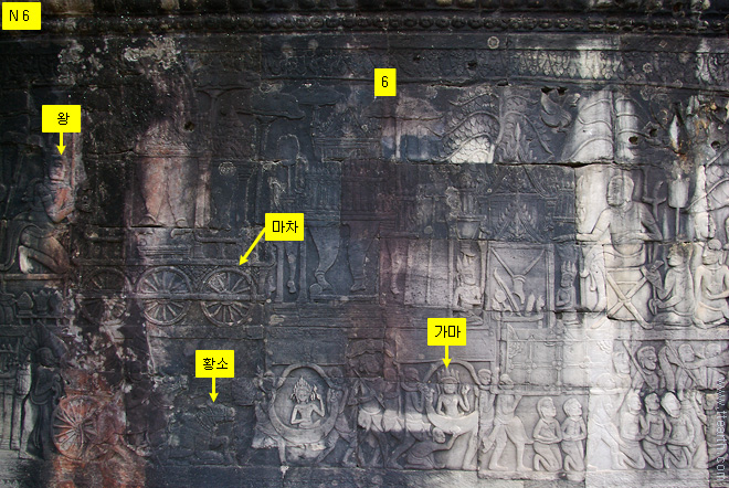 바이욘 2층 회랑 N5의 남쪽면이다. 제일 위의 단에는 걸어서 이동하고 있고, 중간단에는 여인이 가마를 타고 가고 있고, 제일 아랫단에는 황소가 이끄는 마차를 타고 가고 있다.