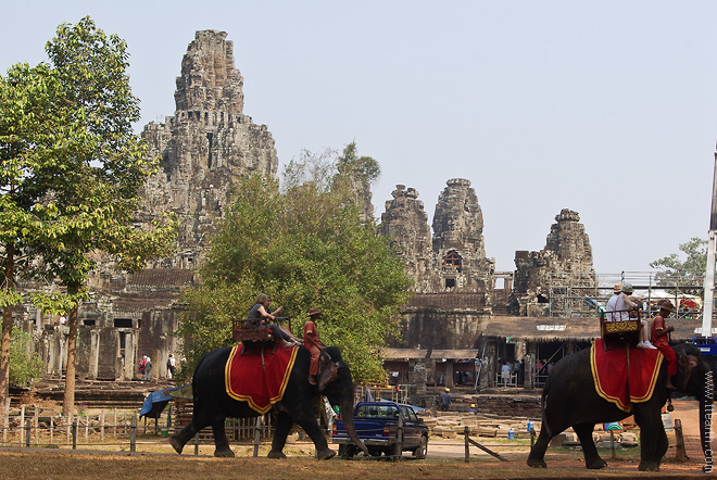 앙코르 톰 남문 앞에서 코끼리를 타고 바이욘 주변을 관광하는 체험 투어가 있다. 코끼리 투어는 사원이 재발견된 이후 초창기에 이용하던 교통 수단으로 왕이 된 기분으로 사원을 둘러 볼 수 있다. 요금은 약 10US$ 정도이다.