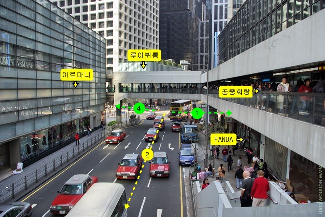 트램 선로가 있는 길(④번 길)은 데 보 로드이다. 동상 광장과 중국 은행 타워, 피크 트램 터미너스로 가는 길이다.