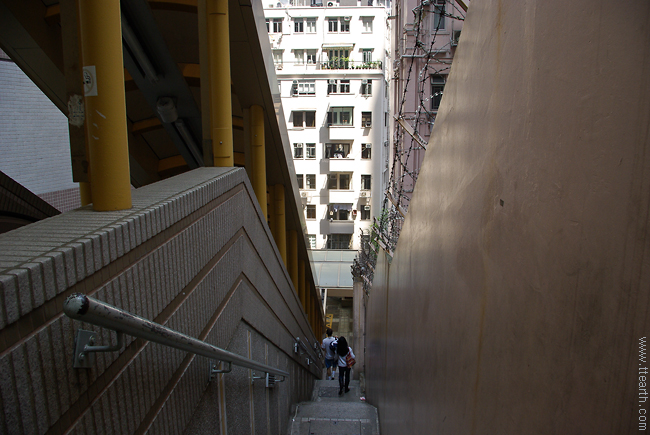 올라갈수록 점점 고층 건물들에 둘러쌓여 있는 위와 같은 모습만 보인다. 이곳은 홍콩의 고급 주거지역이다. 내려올 때에는 걸어서 내려와야 하고, 비좁은 길을 내려와야 한다. 더운 여름날에는 어느 정도 올라갈지 미리 판단한다.