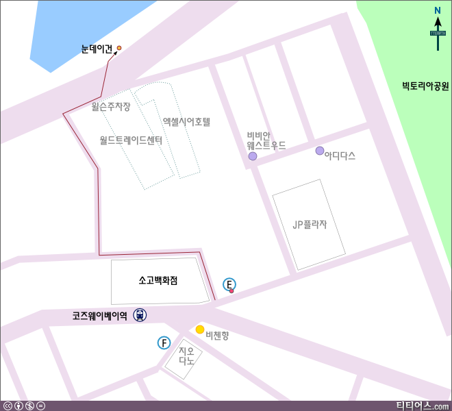 코즈웨이 베이 역 부근 약도. 코즈웨이 베이 역에서 북쪽으로 가면 빅토리아 해안이 나온다. 타이푼 쉘터와 눈데이건으로 가는 길은 월드 트레이드 센터앞의 지하도 외에도 빅토리아 공원 앞의 육교, 시노 플라자 앞의 육교를 건너서 가는 방법이 있다.