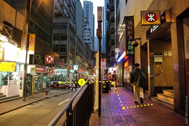 셩완 역 A2 출구 모습. 출구를 나와서 오른쪽(서쪽)을 보면 써클 K와 세븐 일레븐이 보인다. 두 가게 사이의 골목으로 들어간다.