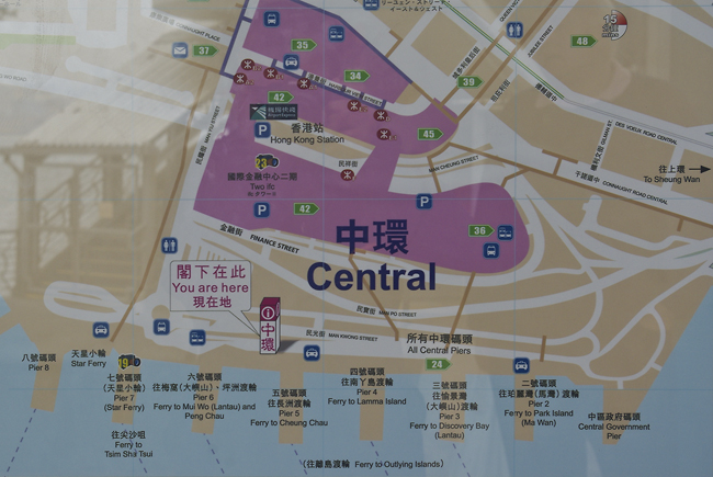 카우롱 반도(침사추이)에서 스타페리를 타고 오는 경우 7번 선착장을 나오면 보이는 모습이다. 건물을 나와서 오른쪽(6번 선착장쪽 방향, 초록색 회랑을 따라)으로 간다.