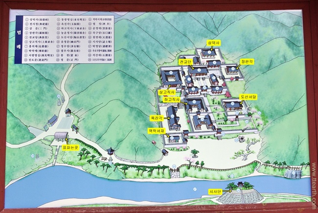 정문으로 들어간다. 들어서면 왼쪽에 농운정사와 하 고직사가 있고 오른쪽에 도산 서당이 있다. 정면에 진도문이 보이고 진도문 양쪽에 서 광명실, 동 광명실이 있다. 그리고 계단 양쪽에 매화 나무들이 있다.