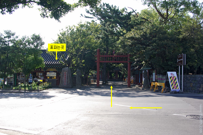 입구 홍살문 양쪽에 돌하르방이 있다.