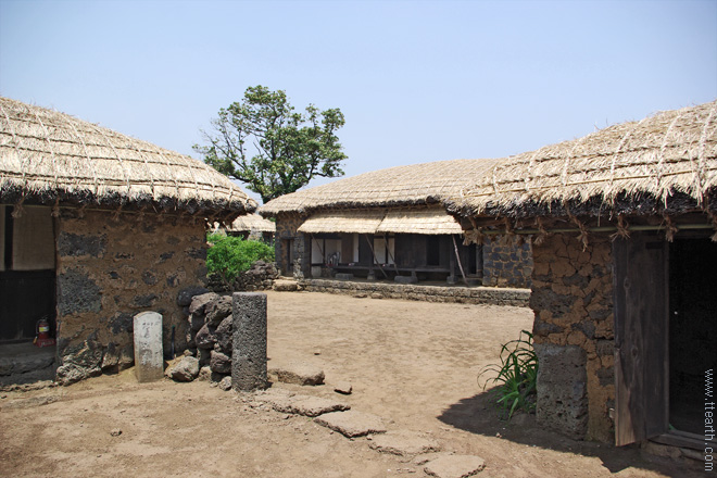 곳곳에 '민속 마을 주차장' 또는 '민속 마을 구경하는 곳(집), 주차장'이라고 쓰인 곳이 있다. 차를 세우면 누군가가 와서 무료라고 말하며 일정한 코스에 따라 초가집, 대문의 막대기, 흑돼지, 나무에서 빗물을 모으는 빗자루처럼 생긴 도구, 물허벅 등을 설명해 줄 것이다. 그리고는 판매 가게로 데려 가는데, 대부분의 사람들은 가이드를 해 준 것이 고마와 뭔가를 하나씩 사게 된다. 오미자, 고사리, 건강 식품 등인데, 가격은 조금 비싸다.
