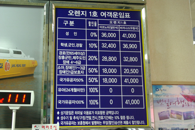 장흥-성산포 오렌지1호 운임.