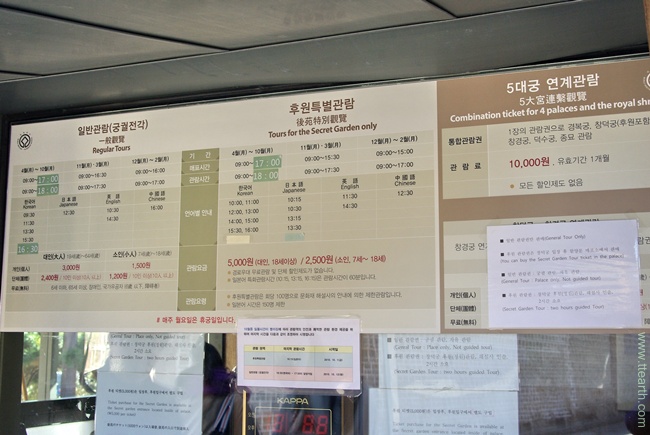 매표소. 왼쪽은 궁궐 전각 일반 매표소이고, 오른쪽은 후원특별관람 매표소이다. 전광판에 후원특별관람 가능 여부를 시간별, 국가별로 남은 인원수를 표시하고 있다.