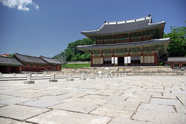 인정전은 경복궁의 근정전과 비교하면 월대 높이도 낮고 난간도 없다. 월대 주변에 드므와 부간주를 두어 화재 예방과 액운을 막아주기를 기원하였다. 일제 시대에 마당의 박석을 없앤 것을 최근에 복원하여 기계로 다듬어 네모나게 반듯하게 깔아 놓았다. 사진 왼쪽의 인정전 서쪽 행랑의 첫번째 건물은 제사 지낼 향을 보관하던 향실이다.