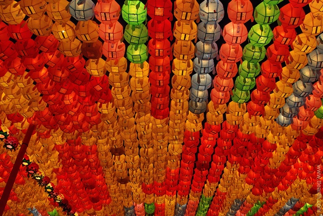 연등 축제 거리 행진. 연등 축제 중 연등 행렬은 부처님 오신 날 전의 마지막 토요일에 열린다.
