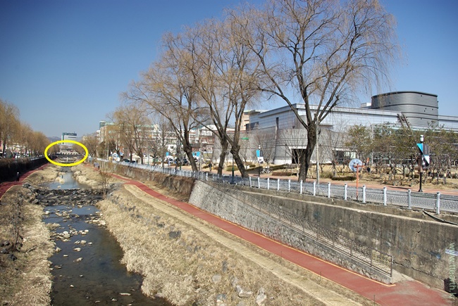 매향교에서 수원천을 따라 북쪽으로 가면 화홍문(사진에 노란색 동그라미)이 나온다.