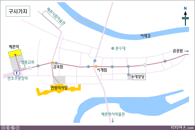 베른 중앙역 부근 지도이다. 베른역을 나와서 성령교회에서 동쪽으로 가면 감옥탑과 시계탑이 나온다.