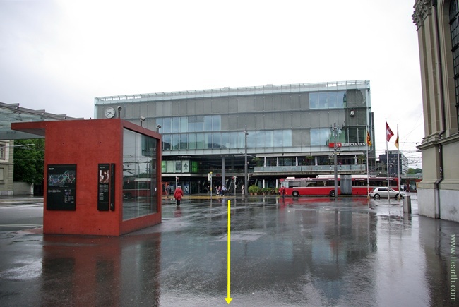 중앙역 앞의 트램 정류장이다. 오른쪽 노란색 사각형 안을 보면 광장이나 길이름을 안내한 표지가 있다. 스위스에서는 도로가 교차하거나 거리가 갈라지는 경우, 거리 이름이 달라지는 경우에 도로 표지판이 있다. 보통 건물 1층에 사람 키 높이 보다 조금 높은 곳에 있다.