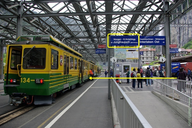벵엔(Wengen), 클라이네 샤이데크(Kl.Scheidegg), 융프라우요흐(Jungfraujoch)라고 적힌 왼쪽 플랫폼에서 WAB 등산 열차를 탄다.
