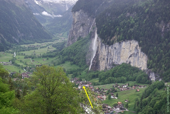 마을 남쪽에 위치한 교회와 슈타우프바흐 폭포. 슈타우프바흐 폭포의 촬영 포인트 지점은 사진에 보이는 교회 부근이다. 305m나 되는 낙차 때문에 물줄기가 내려 오면서 사라지는 듯한 느낌을 준다.