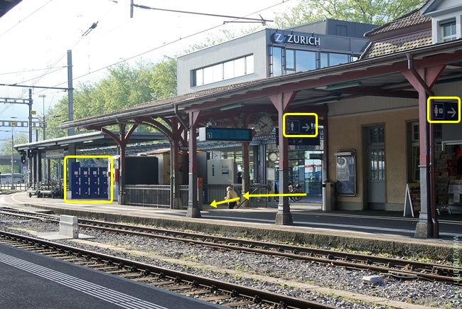 지하도를 내려가면 열차의 시각표가 있다(녹색 네모). 목적지, 경류지, 출발지, 출발 시각, 도착 시각, 출발 플랫폼 번호가 적혀 있다. 직진하여 계단을 올라가면 브리엔츠로 가는 유람선 선착장이 나온다.